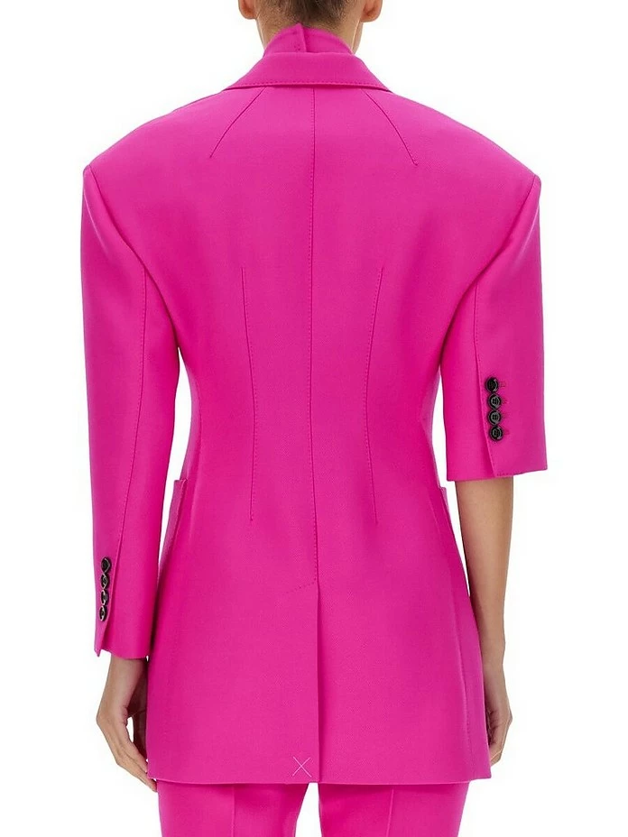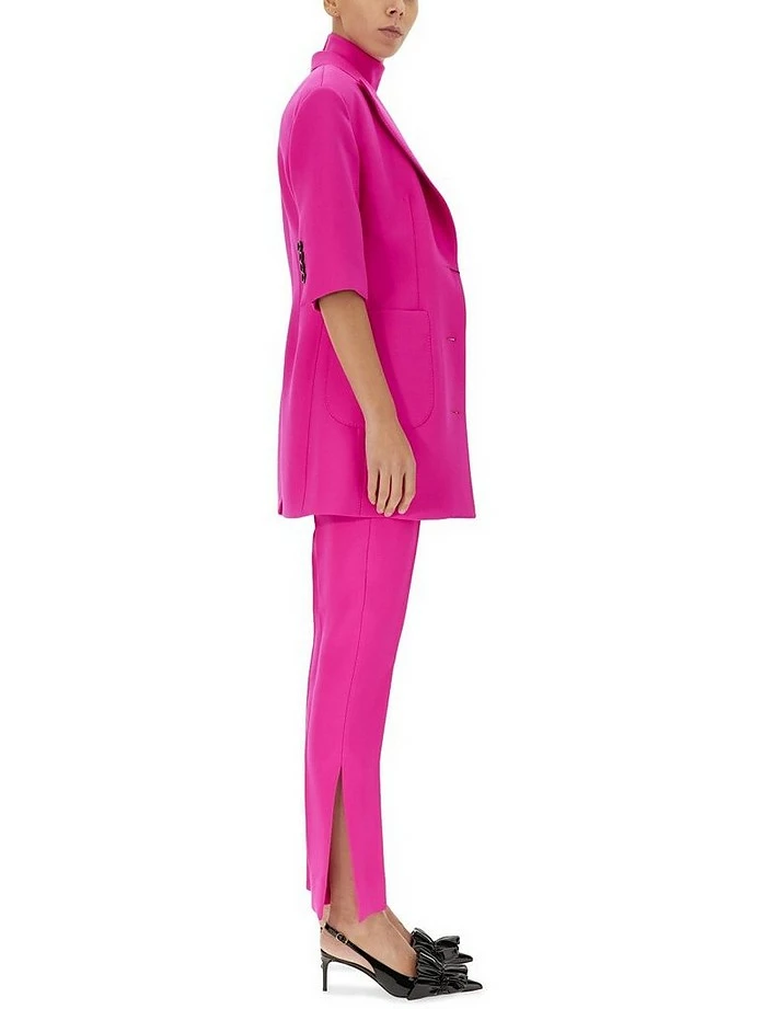 Peaked lapels, front button closure, breast patch pocket, two side pockets, asymmetrical sleeves, single-coat, made in italy, the model is 180 cm tall and wears size 40 it.