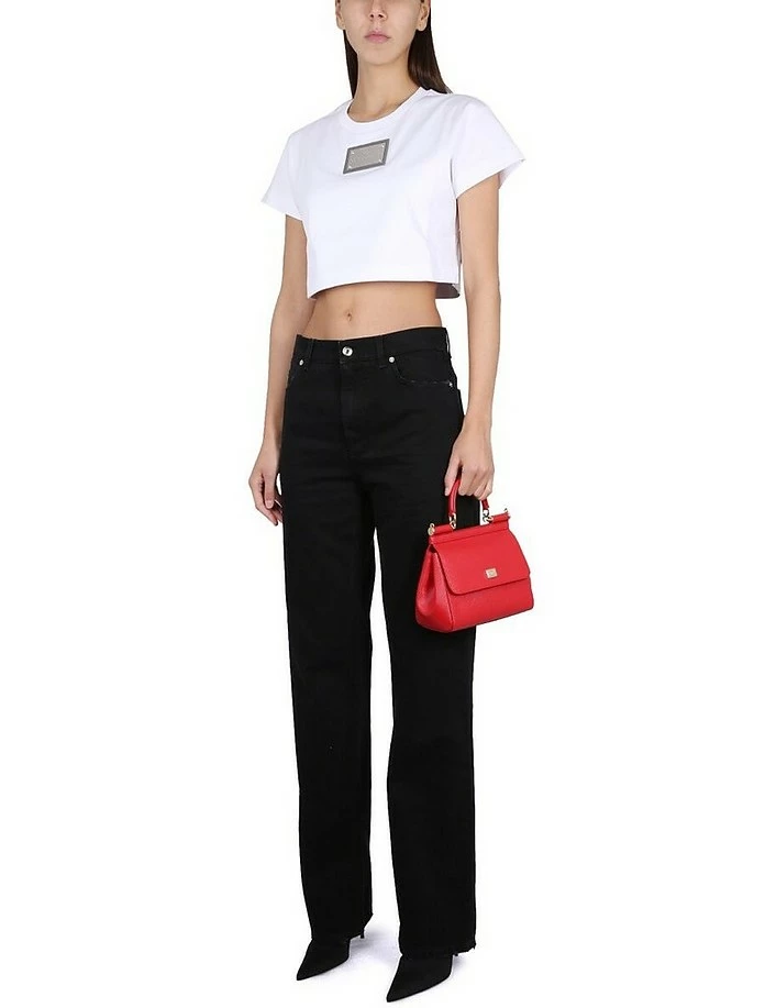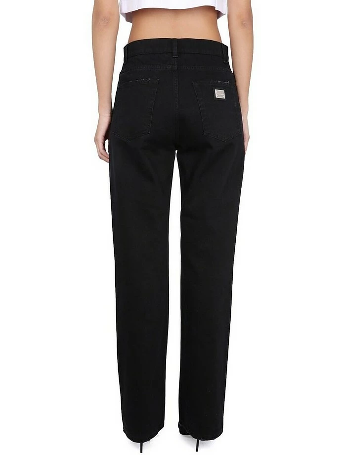 Front zipper and button closure, five pockets, high waist, logo label, flare fit, made in italy, the model is 180 cm tall and wears size 40 it.