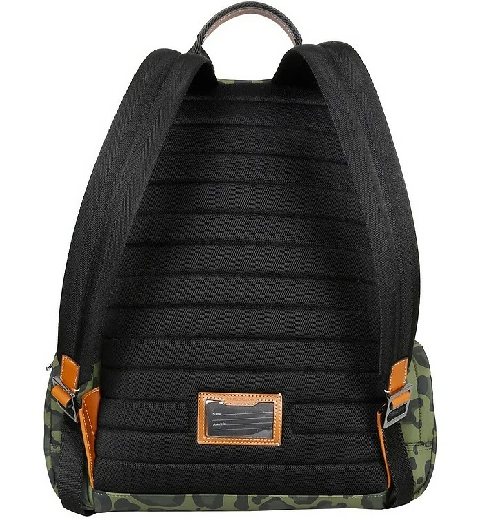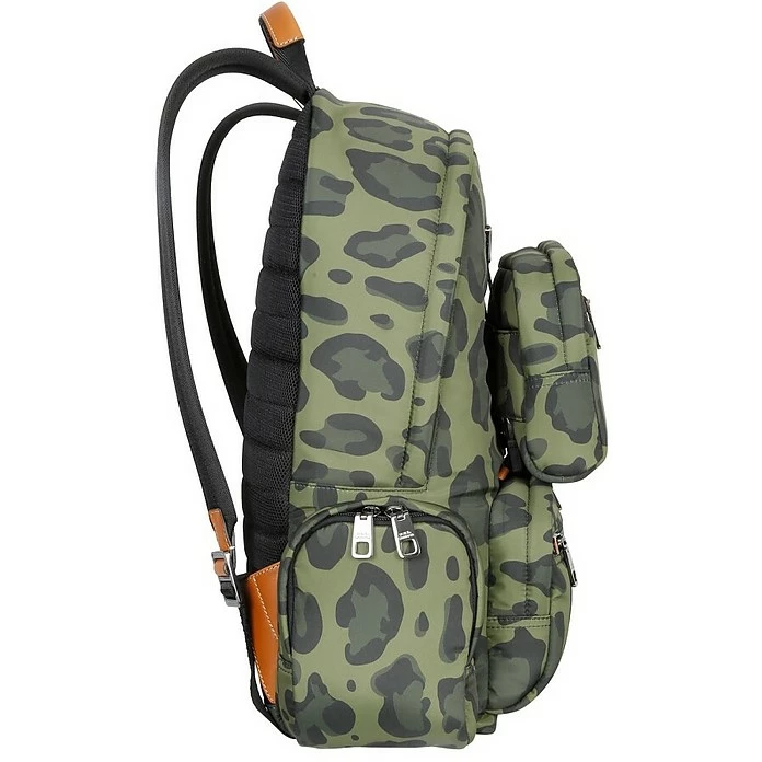 Ribbon top handle with leather details, adjustable shoulder tape straps with leather attachments, double cursor zip closure, outer side pockets with double cursor zipper, front pocket with zip, lined inner with pc compartment, zipped pocket and pocket, made in italy.