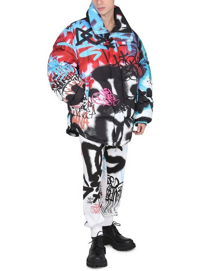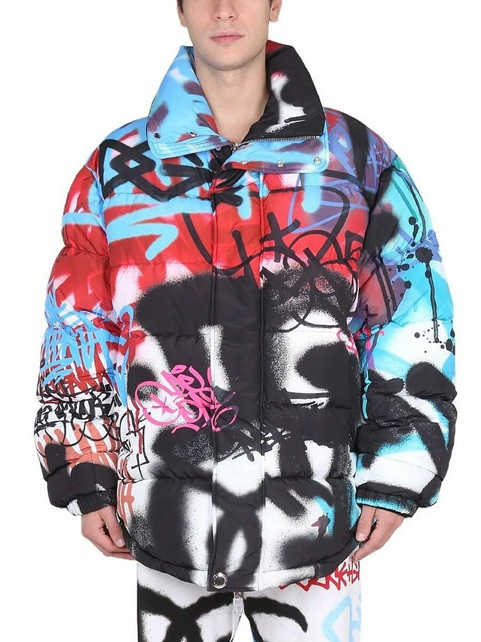 Covered front zipper closure, zippered outside and inside welt pockets, elastic knit cuff sleeve bottoms, internal faux foam padding, oversize fit, made in italy, the model is 190 cm tall and wears size m.