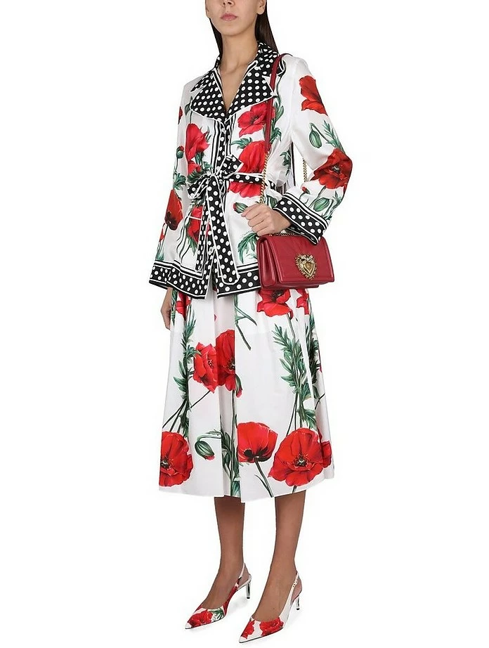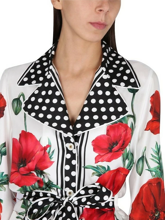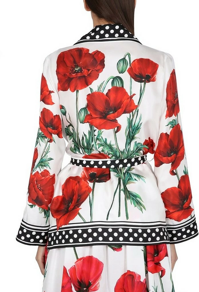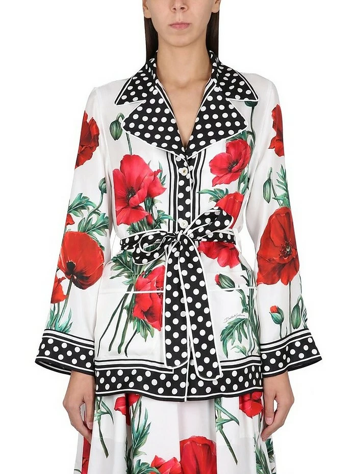 Front closure with adjustable laces, all over poppy and polka dot print, two front patch pockets, relaxed fit, made in italy, the model is 180 cm tall and wears size 40 it.