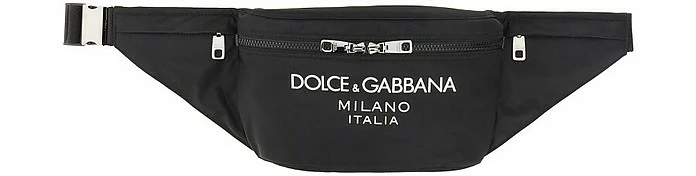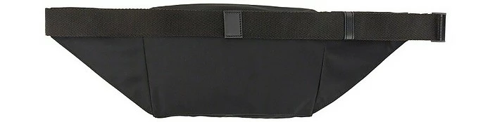Front zipper closure with logoed double slider, rubberized front logo, side pockets, back flat pocket, adjustable ribbon with snap closure, nylon lining and zippered pocket, silver finish metal accessories, made in italy.