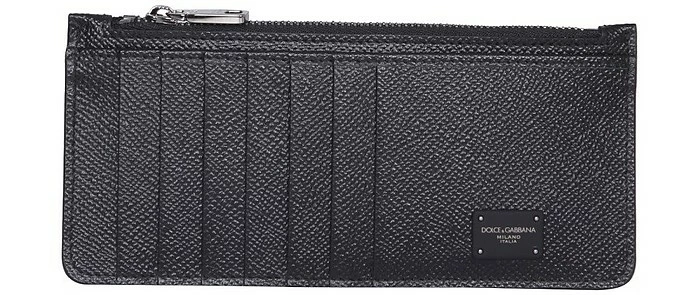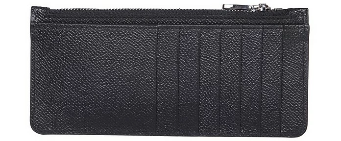 Logo plate, twelve card compartments, banknote zip compartment and two side pockets, made in italy.