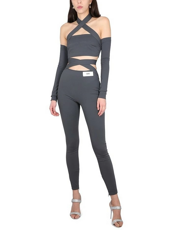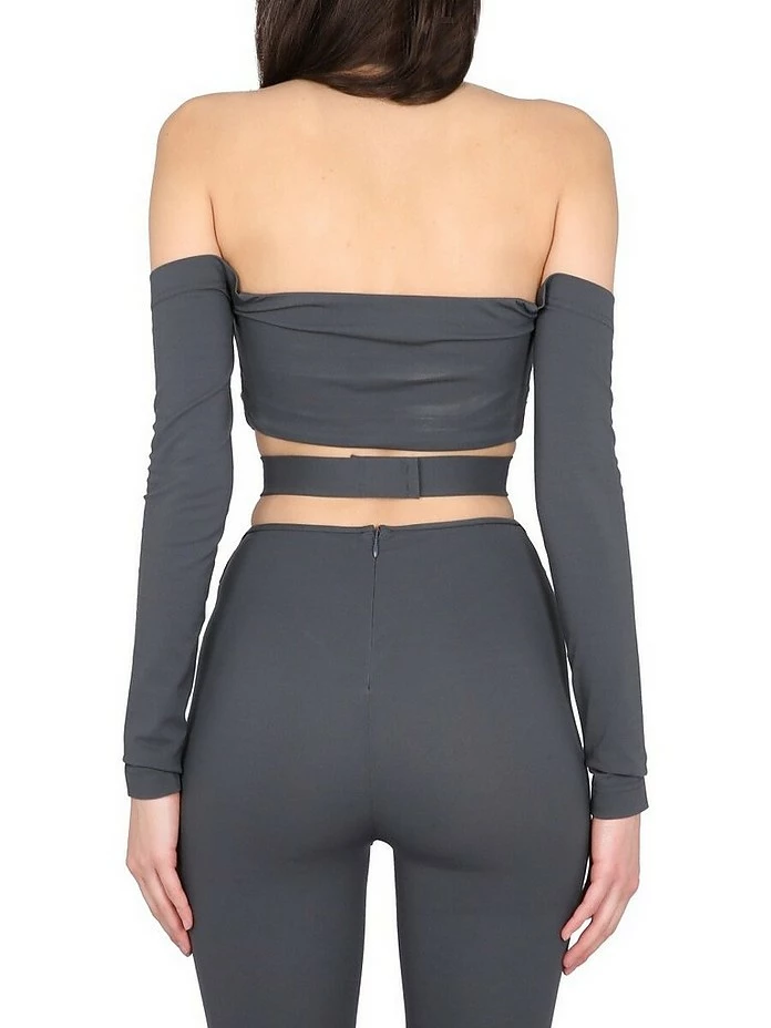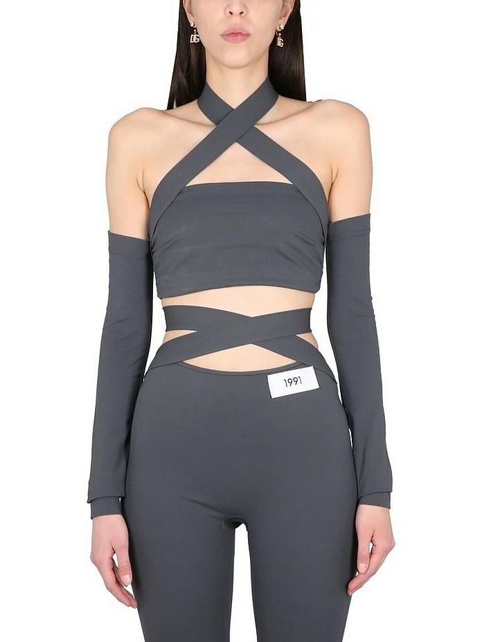 Snap button back closure, straight neckline with crisscross straps, unlined, slim fit, made in italy, the model is 180 cm tall and wears size 40 it.